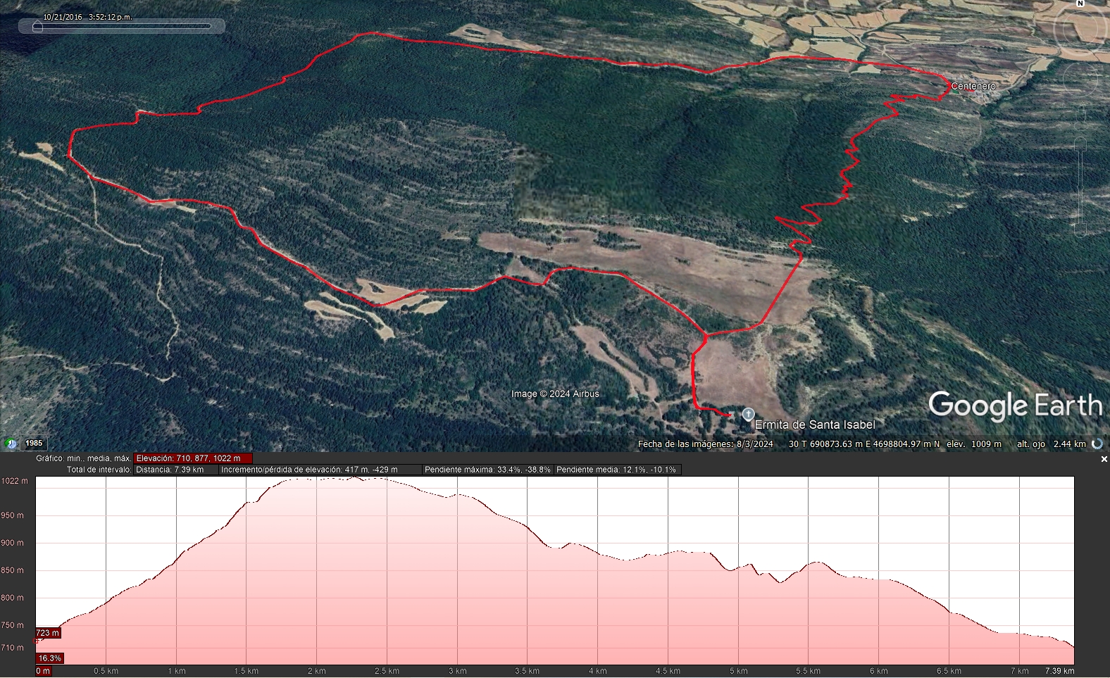 1. LONGITUD Y DESNIVEL8 km distancia horizontal 400 m desnivel acumulado en subida 400 m desnivel acumulado en bajada 2. INFORMACIÓN3 horas (sin contar paradas) ALTITUD MÍNIMA DE LA RUTA: 680 m (Centenero) ALTITUD MÁXIMA DE LA RUTA: 1.030 m (Ermita de Santa Isabel) TIPO DE RECORRIDO: Circular NIVEL SENDERISTA: Moderado: 2 (sobre 4) 3. MÉTODO DE INFORMACIÓN DE EXCURSIONES (MIDE)Medio. Severidad del medio natural: 2 (sobre 5) Itinerario. Dificultad de orientarse en el itinerario: 2 (sobre 5) Desplazamiento. Dificultad en el desplazamiento: 2 (sobre 5) Esfuerzo. Cantidad de esfuerzo necesario: 2 (sobre 5) Para más información sobre el sistema MIDE: